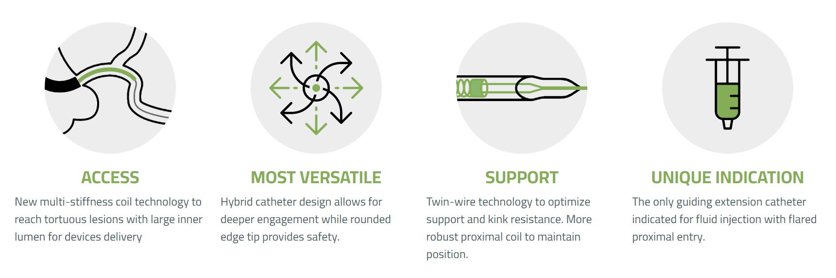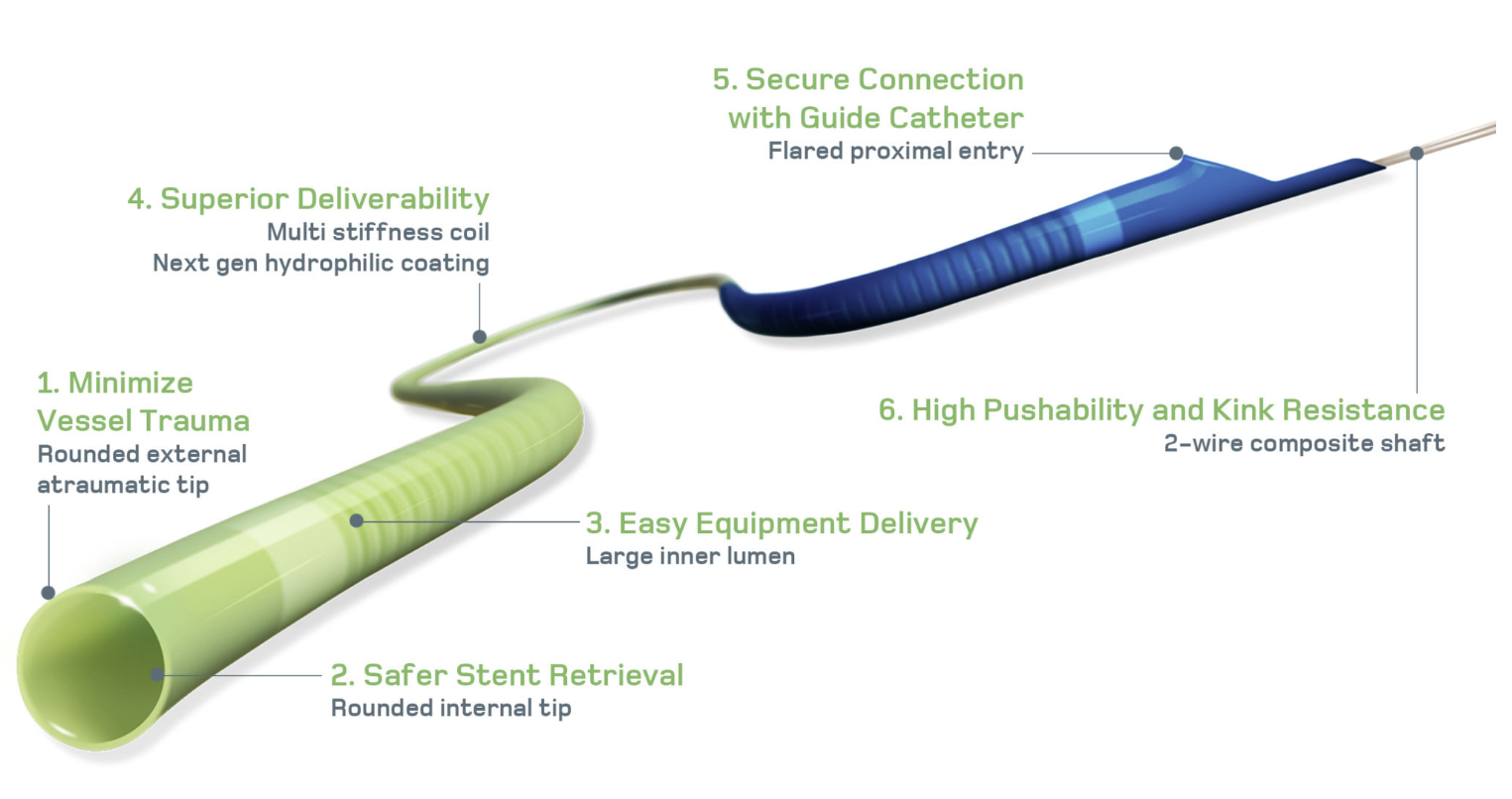Extensor de catéter guía diseñado para brindar un mejor soporte y para la colocación de dispositivos endovasculares.